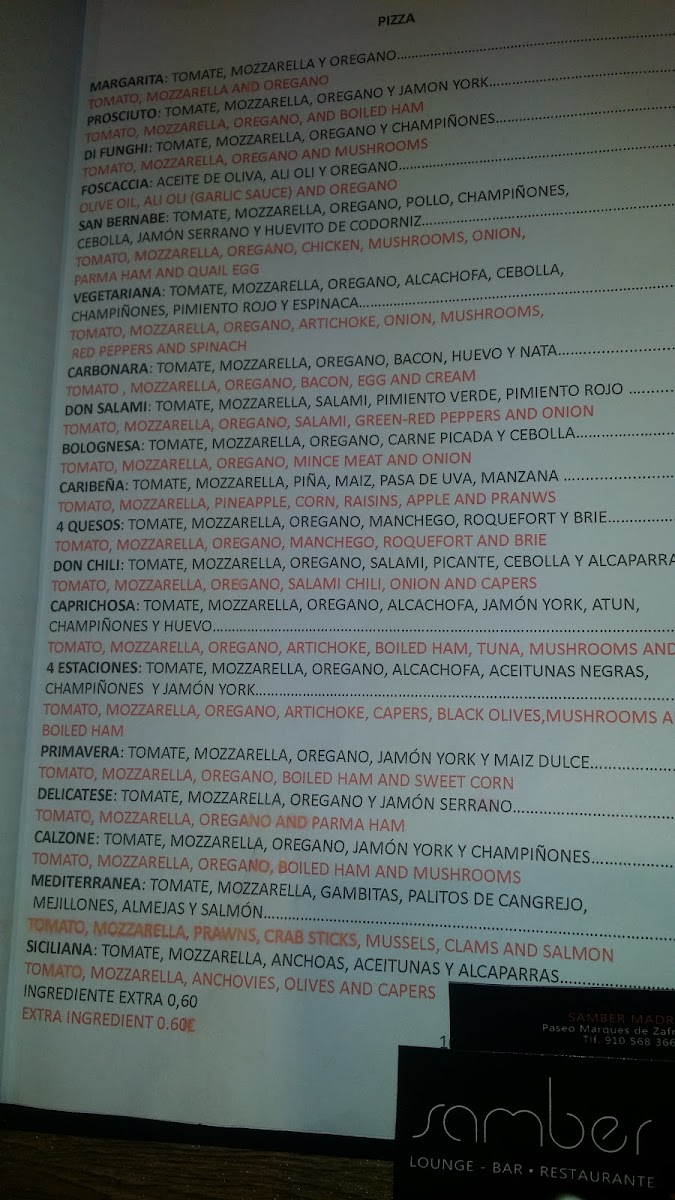 Welcome to SAMBER RESTAURANT PIZZERIA, a delightful culinary gem nestled in the heart of Madrid at Paseo Marqués de Zafra 31A. Whether you're a local or a traveler passing through, this vibrant establishment captures the essence of Spanish dining while also embracing the beloved tradition of pizza.